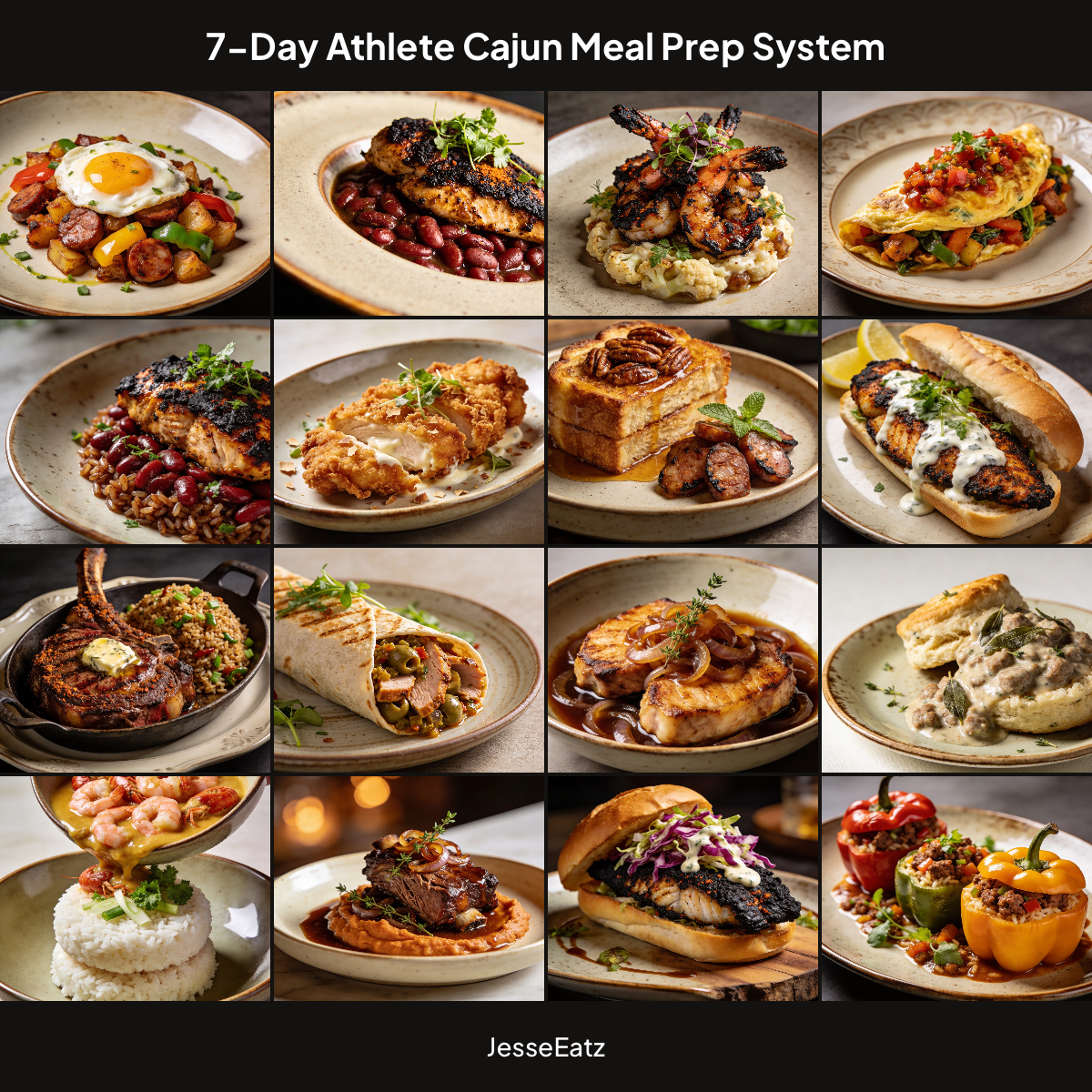 A professional athlete meal system cycling through Cut, Maintenance, and Bulk days using high-protein Southern and Cajun classics. Optimized for training intensity and recovery.