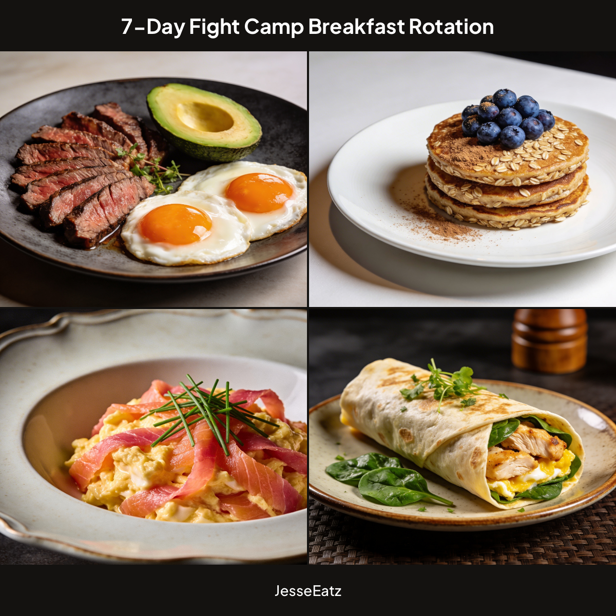 A high-protein breakfast rotation designed for athletes, balancing heavy sparring days with light recovery days.